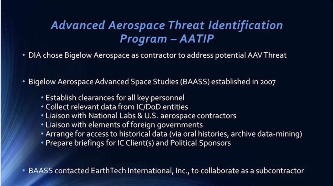 “The Tic Tac UFO which buzzed the USS Nimitz carrier group in 2004 was not only seen by pilots and cameras but also by several high tech sensor systems, as documented in a 13-page report written for the Pentagon, a document that went into the database of AAWSAP, that’s the original acronym for the study Reid sponsored.”