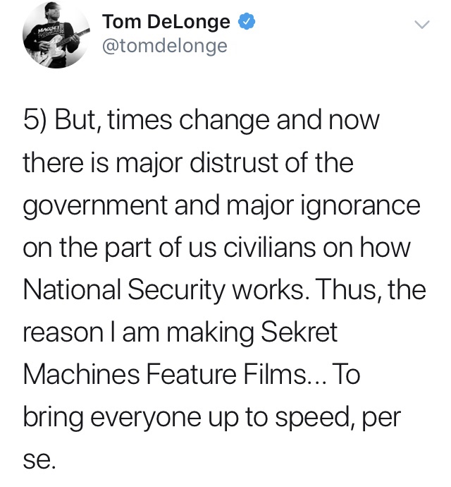 Featured News Full Tom Delonge Twitter Statement by Silva RecordJuly 12, 2019 Support SilvaRecord.com on Patreon. Follow the moment to moment conversation on twitter, Instagram, Facebook. Share this: Click to share on X (Opens in new window) X Click to share on Facebook (Opens in new window) Facebook Like Loading... 3 comments on “Full Tom Delonge Twitter Statement” Pingback: Silva Record Provides Tom DeLonge Tweets On Variety Of Security And TTSA Issues – spacedoutradio Pingback: Thousands of People Have Taken a Facebook Pledge to Storm Area 51 to 'See them Aliens' - CNN Travel — mystery stream | mystery stream Pingback: “Full Tom Delonge Twitter Statement” – Area 51 Comments are closed. Post navigation Previous Post Next Post