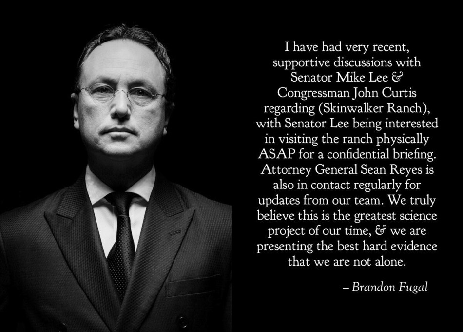 “I have had very recent, supportive discussions with Senator Mike Lee and Congressman John Curtis regarding (Skinwalker Ranch), with Senator Lee being interested in visiting the ranch physically ASAP for a confidential briefing.