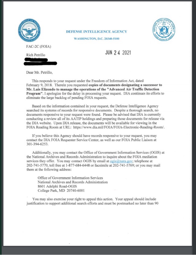 In other news, regarding “AATIP holdings,” the DIA told researcher Rich Petrillo this: